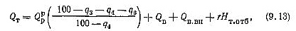 где Qpp - располагаемая теплота топлива, кДж/кг или кДж/м3, определяемая по формуле (2.2); QB - теплота, внесенная в топку воздухом, поступающим из воздухоподогревателя, и теплота воздуха, вносимая с присосами, кДж/кг или кДж/м3; QB вн - теплота, внесенная в топку воздухом при подогреве его вне котла, кДж/м3 или кДж/кг; гНт.отб - теплота рециркулирующих газов в случае возврата их в топку, кДж/кг или кДж/м3; r - доля продуктов сгорания, отбираемых на рециркуляцию; Нт.отб - энтальпия газов в месте отбора; q3, q4, q6 - потери теплоты от химической неполноты сгорания, механического недожога, с теплотой шлаков и охлаждающей водой, кДж/кг или кДж/м3.