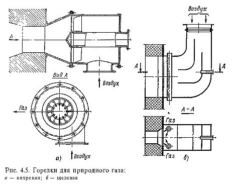 Интенсификация перемешивания газа с воздухом достигается также турбулизацией газовоздушного потока путем его закручивания, что требует, однако, некоторого повышения давления воздуха перед горелкой по сравнению с давлением при прямоточном потоке. Указанные способы интенсификации перемешивания газа и воздуха реализованы в горелках (рис. 4.5), применяемых на сжигание газообразного топлива с высокой теплотой сгорания - природного газа. Так, в горелке, изображенной на рис. 4.5, а, газ поступает в центральную трубу и выходит в камеру смешения через ряд мелких отверстий. Воздух поступает по межтрубному пространству вращательно благодаря тангенциальному подводу к горелке, а также направляющим лопаткам. В другой горелке (рис. 4.5, б) газ из двух газоподводящих трубок выходит со скоростью 50 м/с через большое количество мелких отверстий, пересекая воздушный поток.