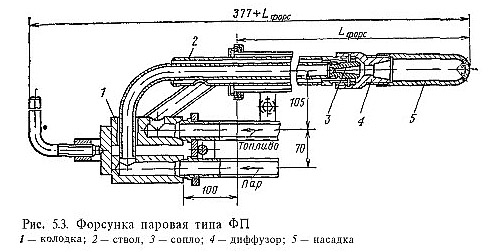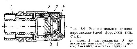Из входного штуцера мазут попадает в кольцевой канал ствола форсунки между внутренней и наружной трубками. Пар поступает во внутреннюю трубу и выходит через расширяющееся сопло с высокой скоростью. Мазут, пройдя кольцевой канал, попадает в поток пара через кольцевую щель, образуемую отрезком сопла паровой трубы и внутренней конической поверхностью диффузора, где и распиливается. Качество распыливания мазута зависит от скорости истечения пара. Имеющийся на выходе форсунки насадок предназначен для увеличения угла раскрытия конуса распиливаемого мазута. Паровые форсунки типа ФП выпускаются различных типоразмеров производительностью по мазуту до 0,5 кг/с (1800 кг/ч). Давление пара перед форсункой 0,4- 2,5 МПа, давление мазута - 0,4-0,5 МПа. Относительный расход пара на распыл мазута 0,4 кг/кг. Для улучшения взаимодействия пара и мазута применяются также форсунки с многосопловым распыливателем.