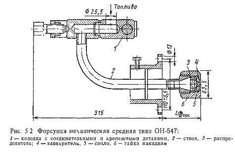 Механические мазутные форсунки. Широкое распространение получили механические форсунки завода «Ильмарине». На рис. 5.2 показана механическая форсунка типа ОН-547, предназначенная для распыливания топочного мазута по ГОСТ 10585-75 в топках стационарных паровых котлов. Мазутные форсунки выпускаются нескольких типоразмеров. При давлении мазута перед форсункой 2,0 МПа производительность форсунки (типоразмер ОН-547-02) составляет 0,167 кг/с, а при давлении 3,5 МПа - 0,22 кг/с. В пределах одного типоразмера мазутные форсунки выпускаются длиной от 400 мм до 4000 мм. К распыливающей головке мазут поступает через ствол, проходит через отверстия распределителя в кольцевой канал, затем по тангенциальным каналам завихрителя попадает в камеру завихрения, приобретая вращательно-поступательное движение, и далее выбрасывается через сопло в топку в виде пленки, имеющей форму гиперболоида вращения - пелены Взаимодействуя с окружающей газовой средой за счет возникающих пульсаций, пелена распадается на капли, которые в свою очередь от воздействия среды дробятся на мельчайшие капельки.