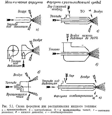 По способу распыливания жидкого топлива мазутные форсунки можно разделить на три основные группы: механические; с распиливающей средой; комбинированные. В механических форсунках распыливание осуществляется главным образом за счет энергии топлива при продавливании его под значительным давлением через малое отверстие - сопло (рис. 5.1, а), или за счет центробежных сил, создаваемых при закручивании топлива (рис. 5.1,б), или при вращении элементов самой форсунки (рис. 5.1,в). Дальнейшее размельчение полученных капель происходит под воздействием давления окружающей среды.