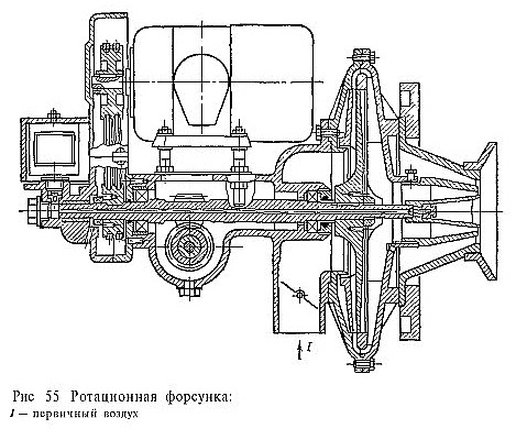 К комбинированным могут быть отнесены и ротационные мазутные форсунки завода «Ильмарине» (рис. 5 5). Мазут по центральному трубопроводу подается в распиливающую чашу с частотой вращения 5-7 тыс об/мин. Мазут распределяется по внутренней поверхности чаши и в виде тонкой пленки выбрасывается в топочною камеру, дроблению пленки способствует первичный воздух, поступающий при давлении 0,01 МПа через зазор на выходе из чаши. Воздух подается крыльчаткой вентилятора, сидящеи на одном валу с приводом чаши В качестве привода применяются электродвигатели с большой частотой вращения, а также воздушные и паровые турбины. Первичный воздух составляет около 20 % общего количества воздуха, необходимого для горения мазута Остальной воздух посыпает в топку через кольцевое пространство, образуемое соплом и кожухом форсунки. Ротационные мазутные форсунки не требуют тщательной фильтрации мазута, дают хорошее распиливание и обладают широким диапазоном регулирования производительности (15-100%). Недостатками таких форсунок являются сложность конструкции и шум при работе. В последнее время благодаря указанным положительным особенностям ротационные форсунки начинают находить все расширяющееся применение как автономные мазутные форсунки, так и в комбинированных газомазутных горелках.